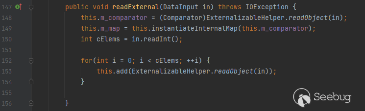 然后 153 行,會調用 this.add ,this.add 會調用 this.m_map.put 方法,也就是說調用了 TreeMap 的 put 方法,這就導致了 comparator.compare()的調用。