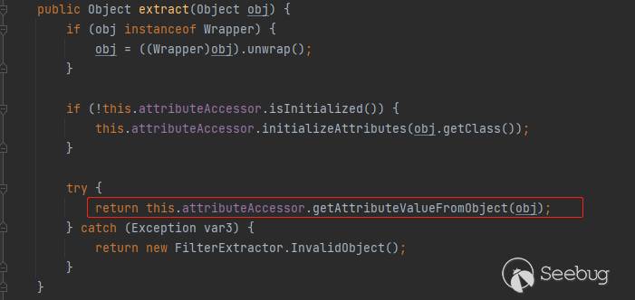 filterExtractor.extract 中存在任意 AttributeAccessor.getAttributeValueFromObject(obj) 的調用,賦值 this.attributeAccessor 為上面說的MethodAttributeAccessor 就可以導致任意無參方法的調用。