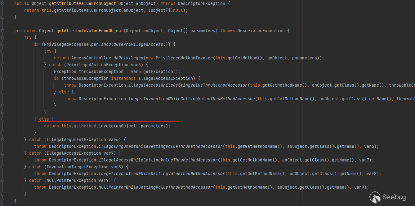 MethodAttributeAccessor.getAttributeValueFromObject,本質是利用MethodAttributeAccessor.getAttributeValueFromObject中存在任意無參方法調用,在 CVE-2021-2394 中也利用到了。