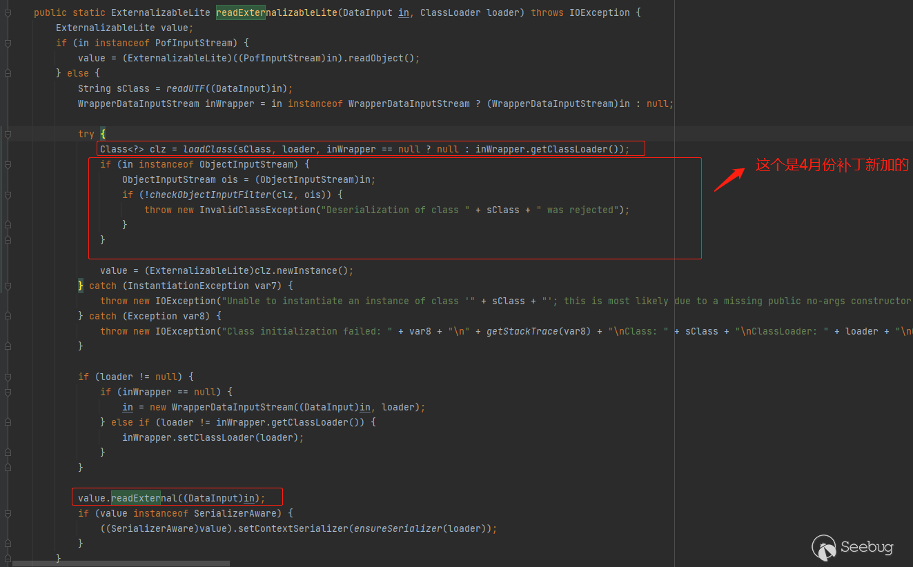 CVE-2020-14756 的修復方法則是對 readExternalizable 方法傳入的 Datainput 檢查,如果是 ObjectInputStream 就調用 checkObjectInputFilter() 進行檢查,checkObjectInputFilter 具體是通過 jep290 來檢查的。