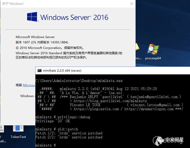 由于mimikatz中內存搜索的標記覆蓋的windows版本不全,所以經常會出現patch失敗的問題。例如在我的Windows Server 2016上,第二步patch就會失敗,這種情況多半是因為mimikatz中沒有該系統版本對應的內存patch標記