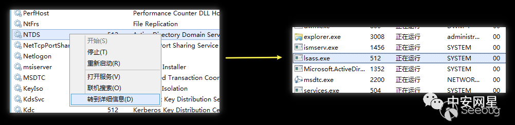 我們以Windows Server 2012 R2環境為例來分析,首先我們需要找到NTDS服務所對應的進程,我們打開任務管理器選中NTDS服務,單擊右鍵,選擇“轉到詳細信息”就會跳轉到對應進程,這里NTDS服務對應的進程是lsass.exe