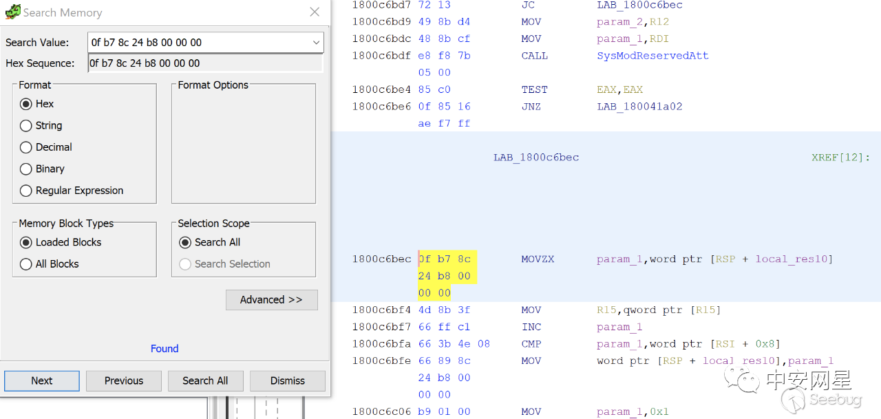同理,按照mimikatz代碼中的標記搜索第二次patch的位置0f b7 8c 24 b8 00 00 00