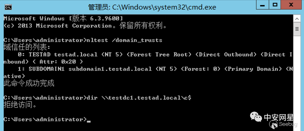 除了這種方法,我們也可以直接修改當前子域對象的sIDHistory屬性,假設我們現在拿到一個子域域控,通過信任關系發現存在一個父域,此時我們無法訪問父域域控的CIFS
