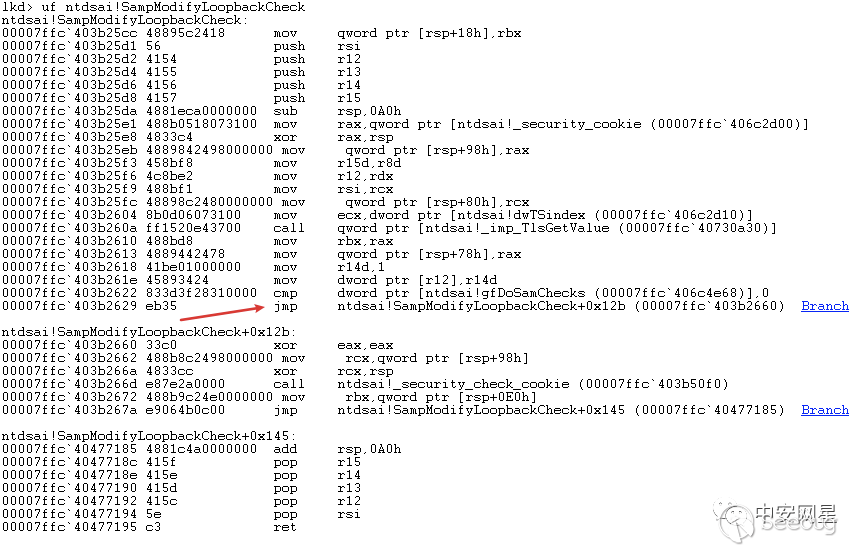 這一部分內容是在函數SampModifyLoopbackCheck()函數的流程中,我們可以使用windbg本地調試對比一下patch前后的函數內容