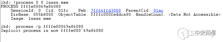 首先我們找到lsass.exe的基址并切換到該進程上下文: