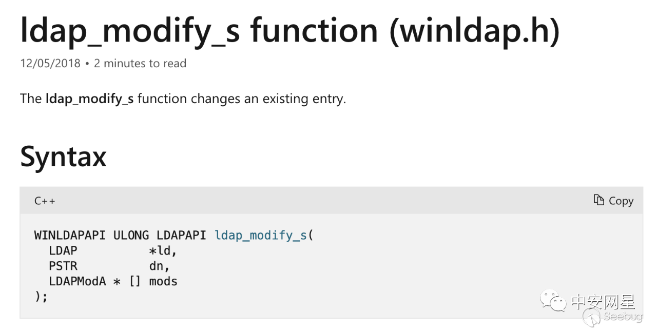 修改時的操作就很簡單了,調用LDAP操作的API對域對象的objectSid進行修改,主要使用的是ldap_modify_s():