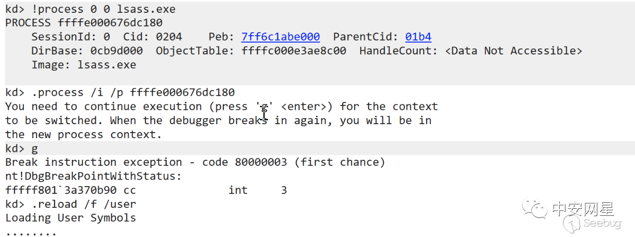 侵入式切換到lsass進程并重新加載用戶態符號表: