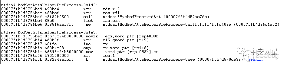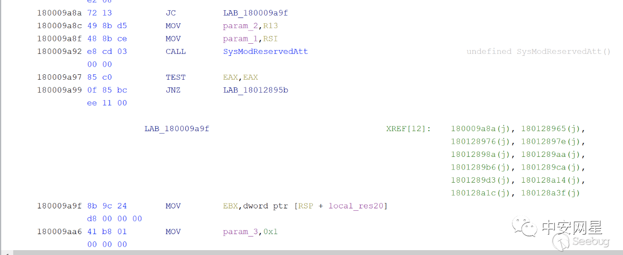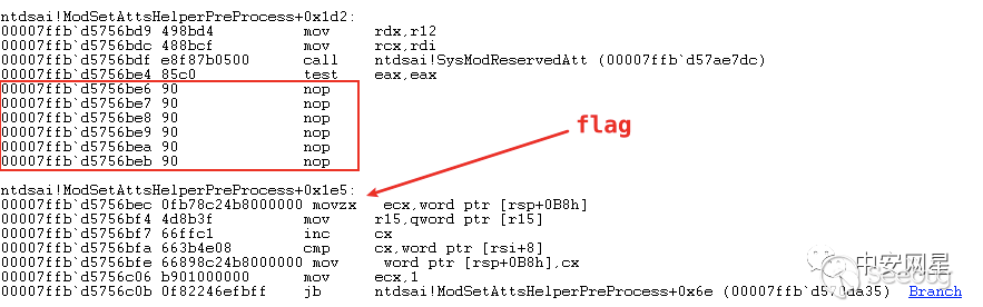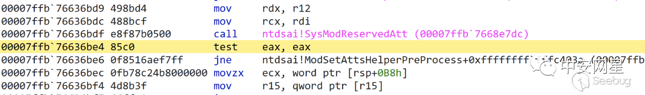 在SysModReservedAtt()執行結束后,正常的修改請求不會在jne處跳轉,而當修改objectSid時會在jne處跳轉,進入返回錯誤的流程