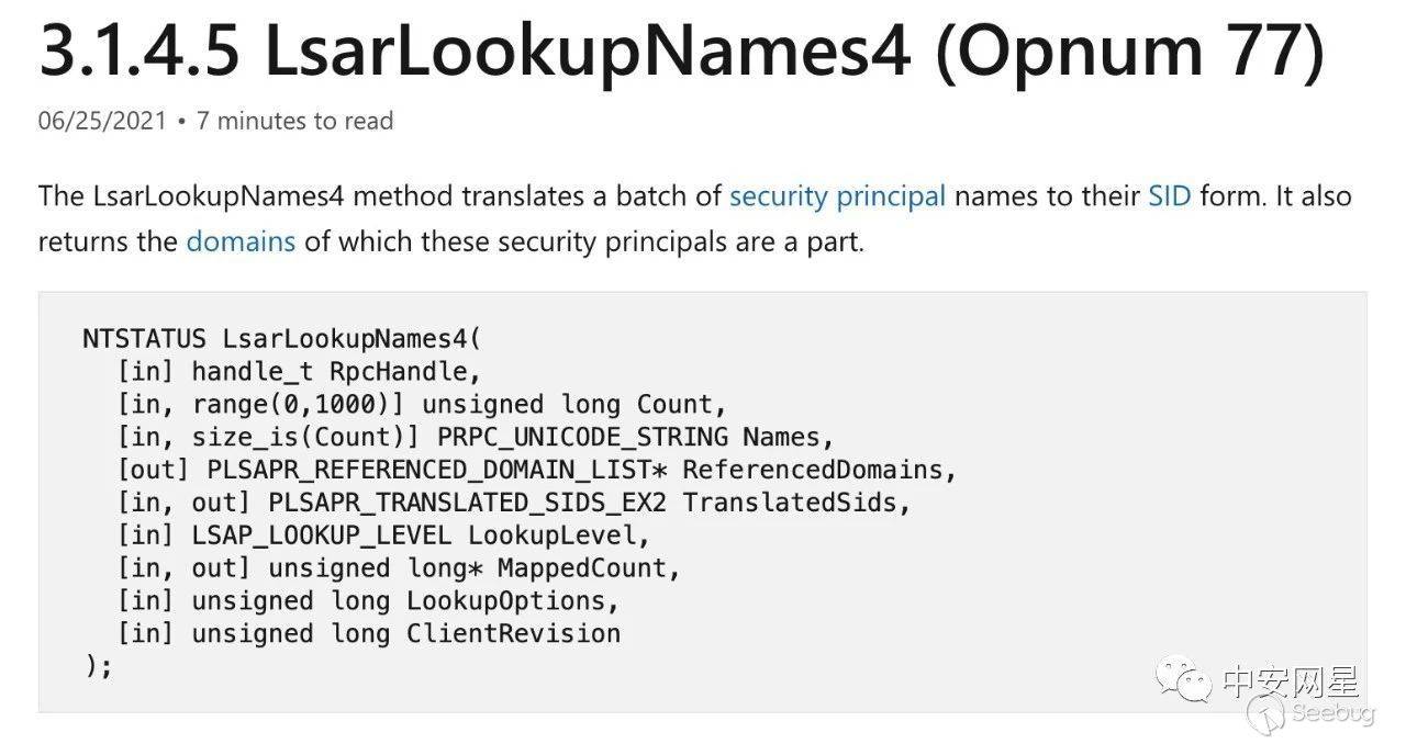 其原理是調用LookupAccountName()和LookupAccountSid()來實現對象名和SID之間的相互轉化,這類API底層是調用MS-LSAT協議(RPC),比如將對象名轉換為SID,底層調用的是LsarLookupNames4()
