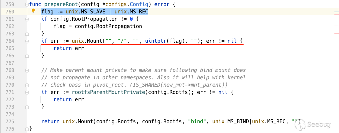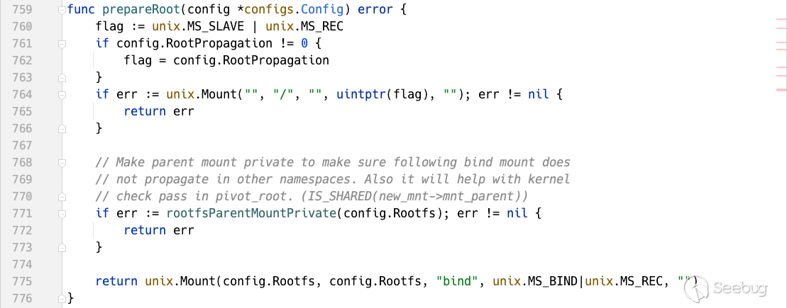 prepareRoot 中設置容器根目錄掛載標志位為 unix.MS_SLAVE | unix.MS_REC ,容器在初始的時候會通過鏡像中的容器標準包(bundle)掛載根文件系統(BaseFS),在這里runC默認將掛載點(Propagation Type)設置為slave。由于當前已經處于容器的mount namespace中,所以當前 \ 為容器根路徑。 rootfsParentMountPrivate 函數確保上一層的掛載點是 PRIVATE ,應該是出于防止逃逸的考慮。