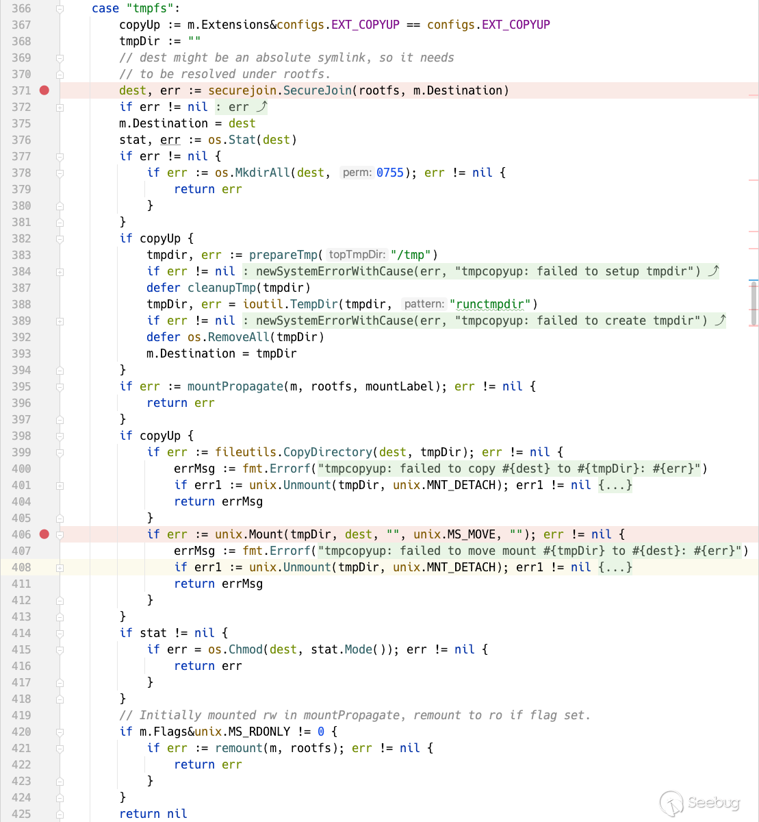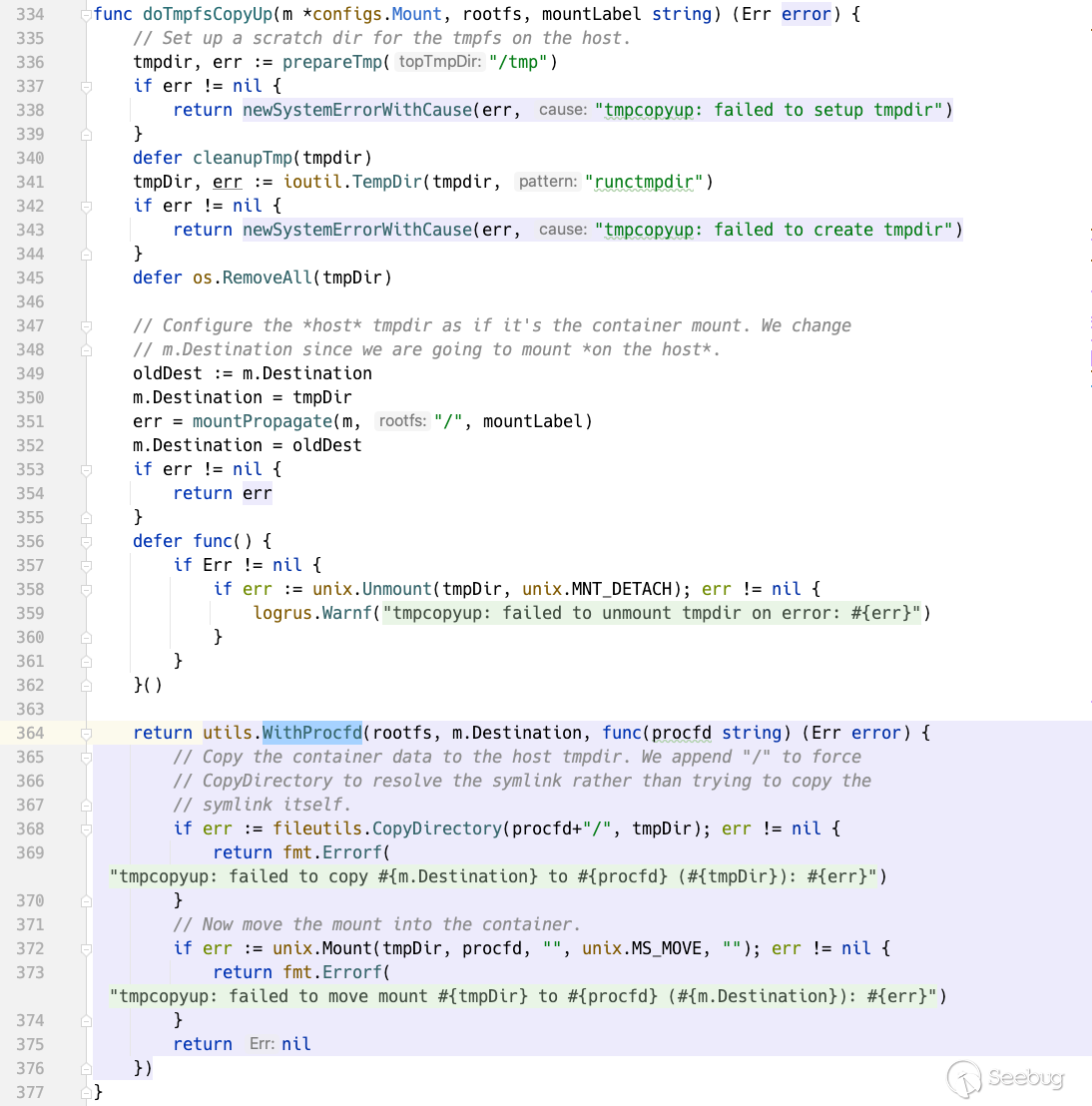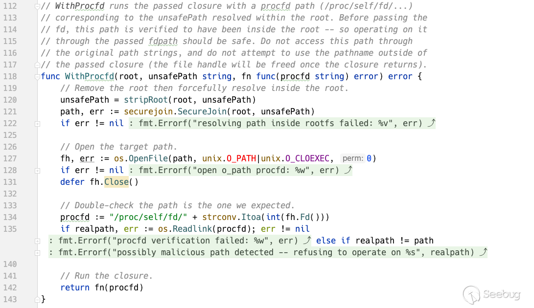 在其中使用 WithProcfd 函數防止TOCTOU漏洞的發生,所有的 securejoin.SecureJoin 移入WithProcfd進行統一處理。