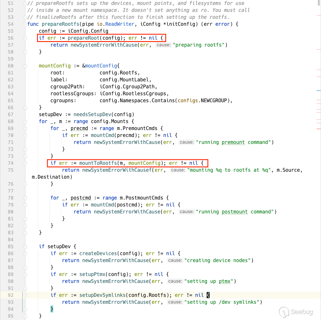 在prepareRootfs 中,調用 prepareRoot 設置初始掛載點,并設置掛載標志位為 unix.MS_SLAVE | unix.MS_REC ,其后使用 mountToRootfs 對container.json中配置的掛載進行操作。