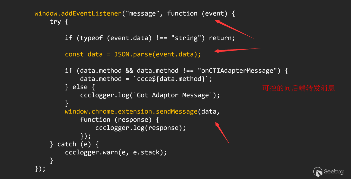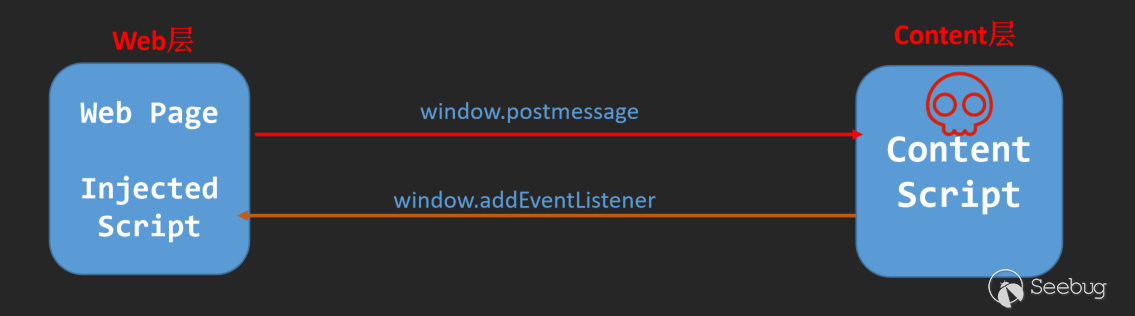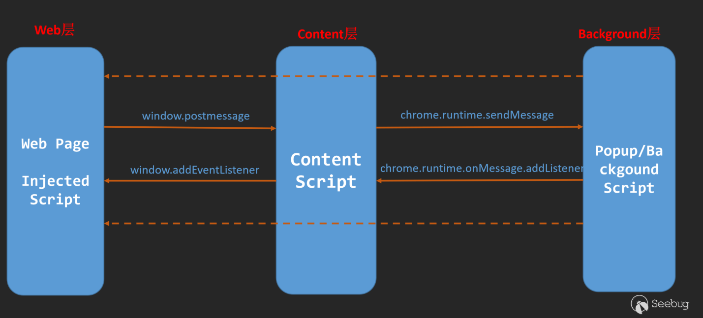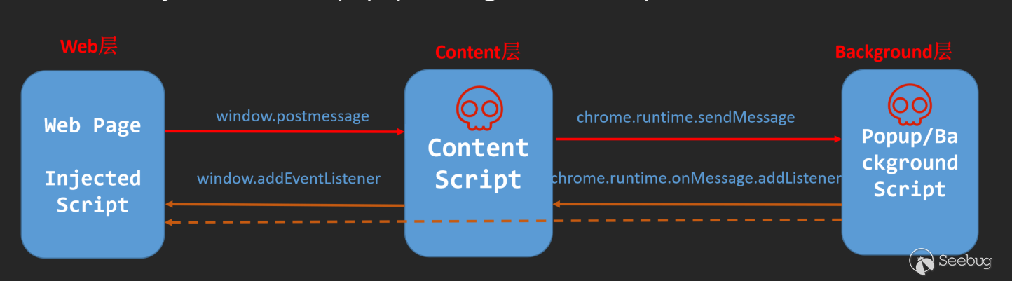而content層中,這部分和Web層主要的區別是它可以訪問很小一部分chrome api,其中最重要的是,它可以和bg層進行溝通。拋開本身js漏洞不談,content層最大的特殊就在于它是一個中轉層,只有content構造的chrome.runtime.sendMessage可以向后端傳遞數據。