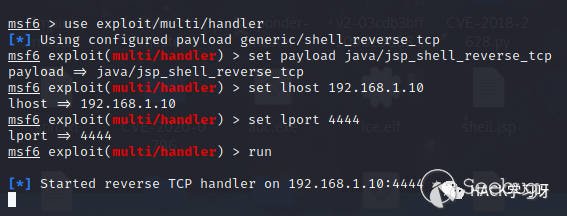 msf開啟監聽,注意payload使用java/jsp_shell_reverse_tcp