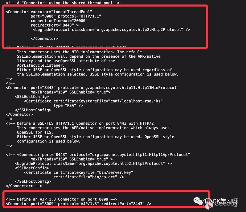 tomcat默認的conf/server.xml中配置了2個Connector,一個為8080的對外提供的HTTP協議端口,另外一個就是默認的8009 AJP協議端口,兩個端口默認均監聽在外網ip。