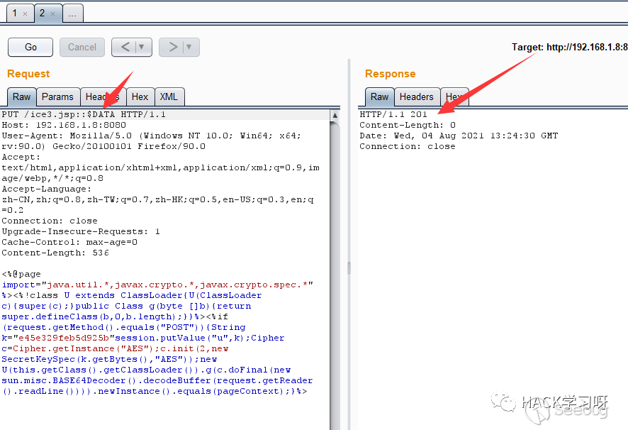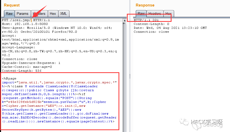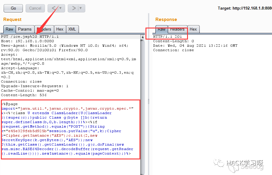 第二種方法為在jsp后綴后面使用/,因為/在文件名中是非法的,在windows和linux中都會自動去除。根據這個特性,上傳/ice1.jsp/,看到返回201