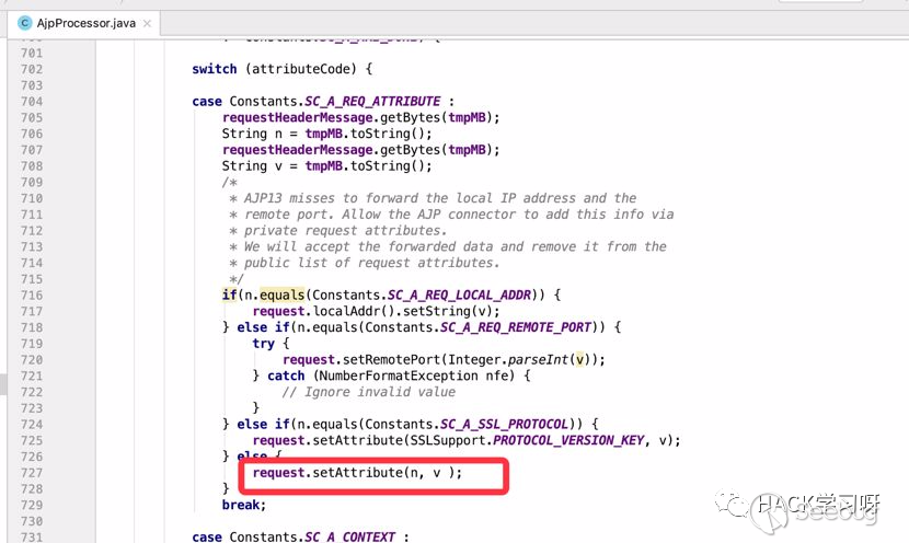 tomcat在接收ajp請求的時候調用org.apache.coyote.ajp.AjpProcessor來處理ajp消息,prepareRequest將ajp里面的內容取出來設置成request對象的Attribute屬性