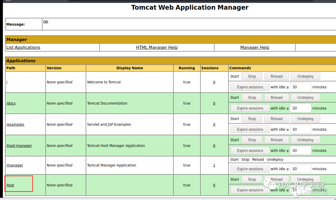 點擊上傳即可看到上傳的test.war已經部署成功