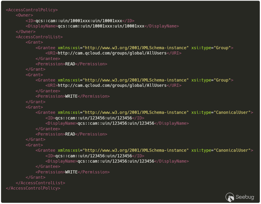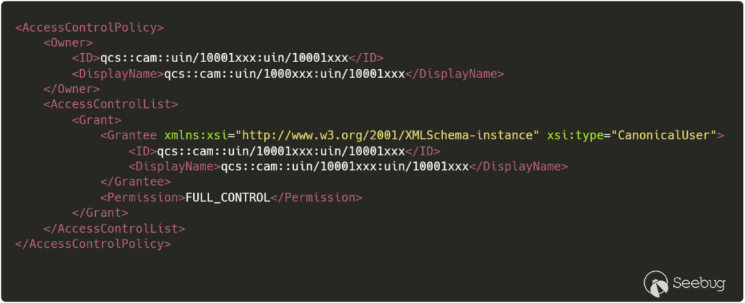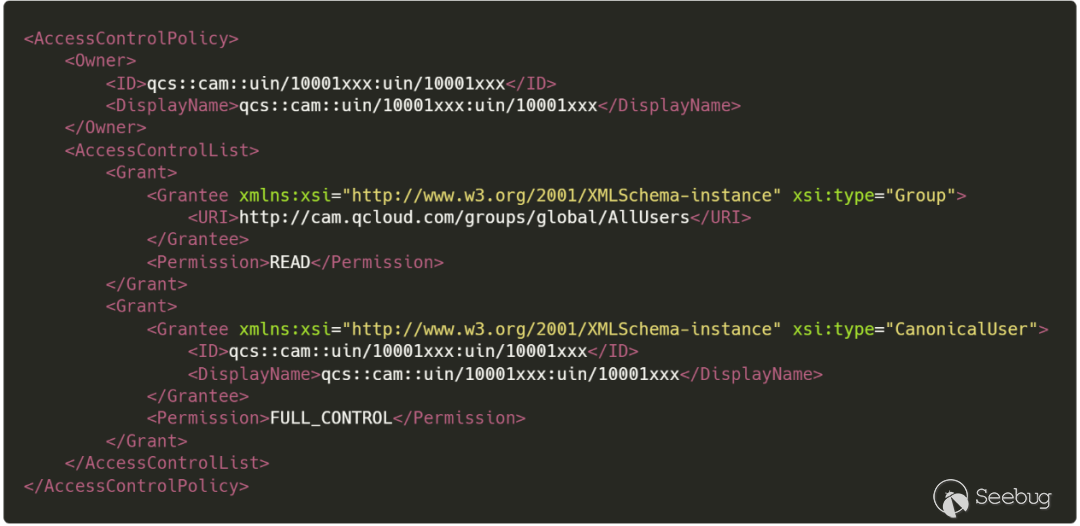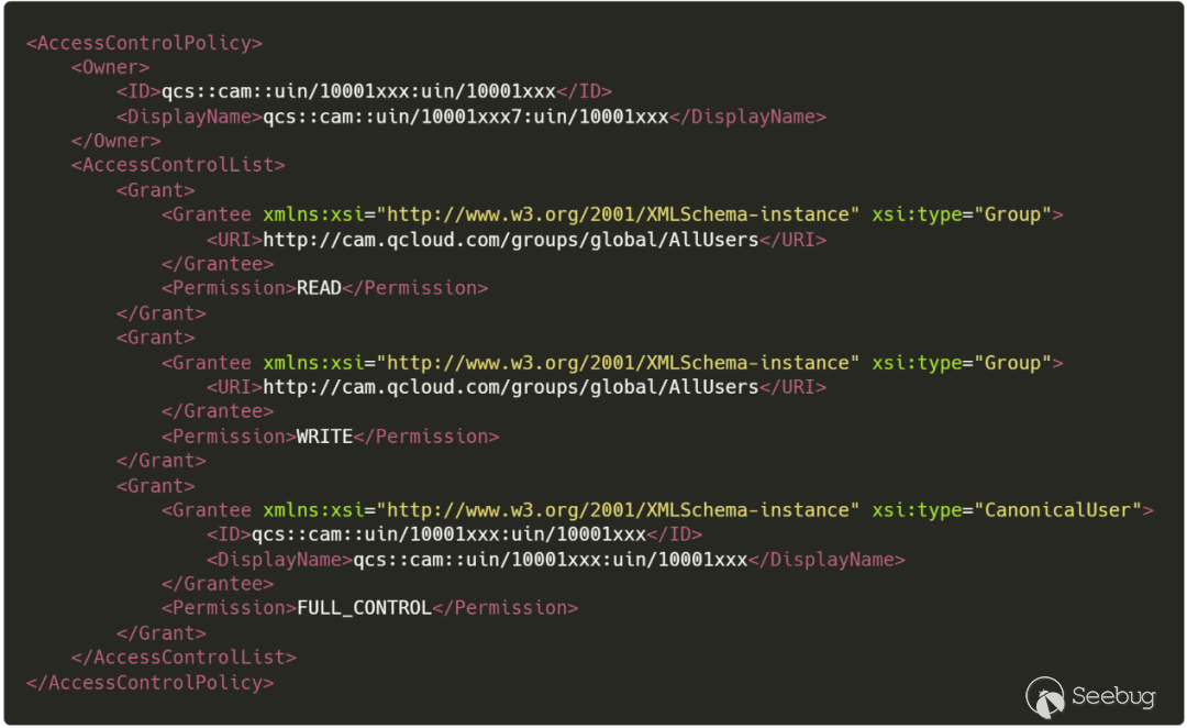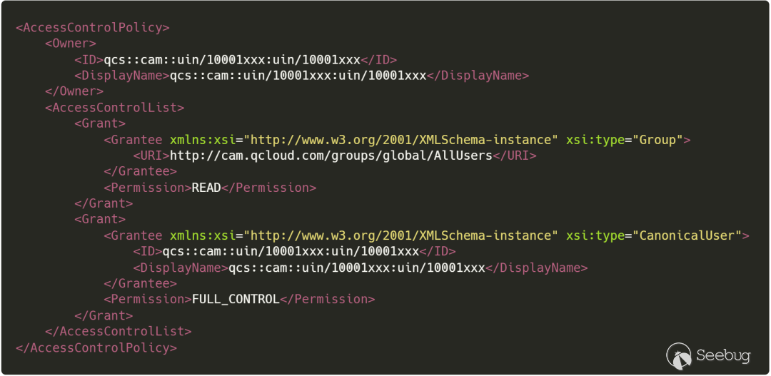 如上所示,ACL 描述了存儲桶擁有者(Owner)為(用戶 UIN:10001xxx),且此用戶擁有存儲桶的完全控制權限(FULL_CONTROL)。