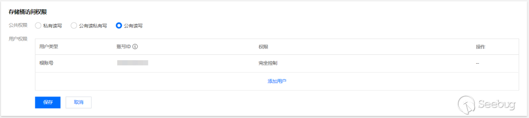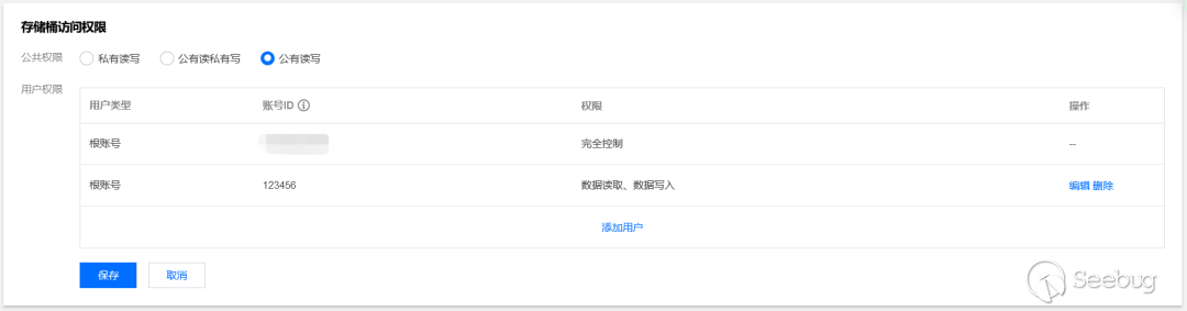 在這環節中,我們將實驗一下公共權限與用戶權限的關系,我們將公共權限設置為公有讀寫,并在用戶權限處添加一個ID為123456的賬號,我們為此賬號設置權限讀取、權限寫入的權限,見下圖: