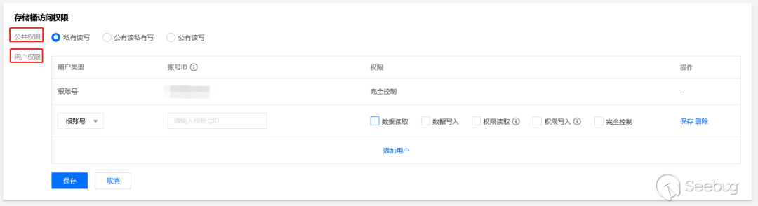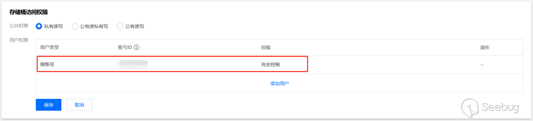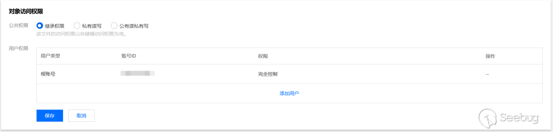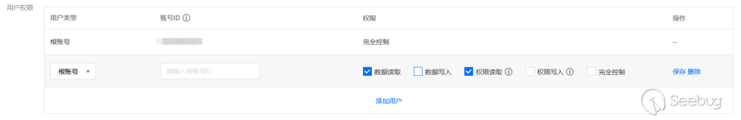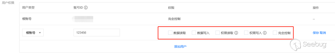 用戶權限可以通過添加用戶進行配置,通過填寫賬號ID并為其配置數據讀取、數據寫入、權限讀取、權限寫入以及完全控制五個選項。