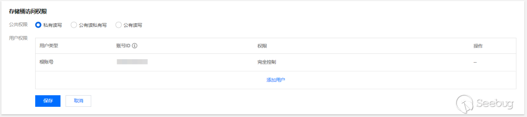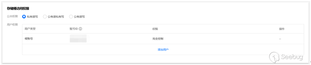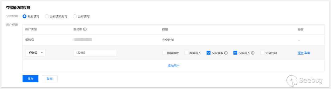 接下來我們保持公共權限為默認的私有讀寫不變,并在用戶權限處添加一個ID為123456的賬號,我們為此賬號設置權限讀取、權限寫入的權限,見下圖: