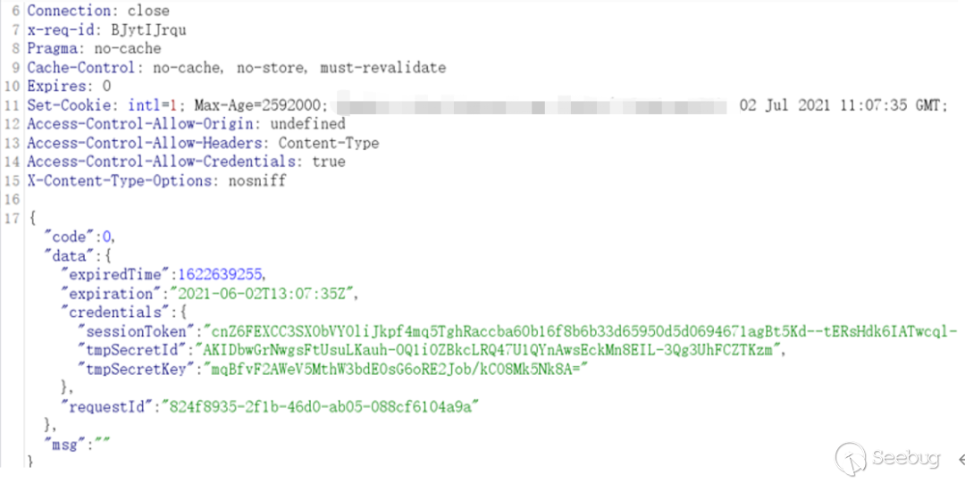 這一錯誤的配置導致了很多嚴重的安全問題,由于在此場景下,Web應用程序使用前端直傳的方式訪問存儲桶,因此后臺生成的臨時密鑰將會發送給前臺,任意用戶通過網絡抓包等手段獲取到的臨時憑據,可參見下圖流量中響應包內容。