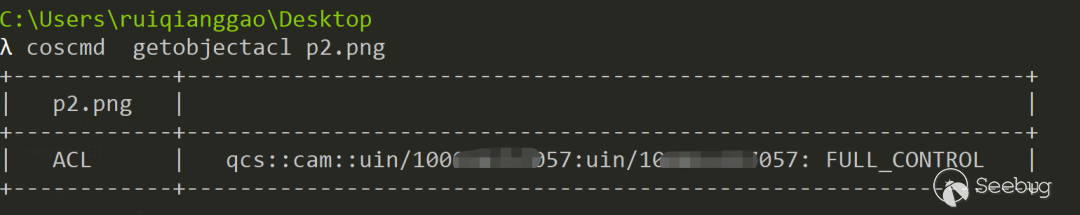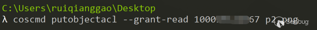 由于該用戶擁有修改存儲桶中對象ACL的權限,因此可以通過如下指令授予該用戶讀取p2.png的權限,見下圖: