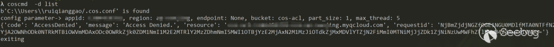 我們在coscmd中配置授權用戶的密鑰信息后,通過coscmd list列出存儲桶中內容。