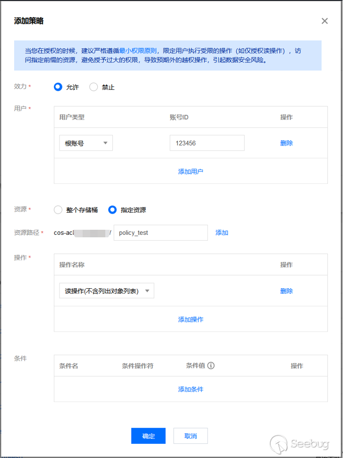 接下來,我們添加一個允許賬號ID為123456的賬號對cos-aclxxx/policy_test路徑的讀操作。