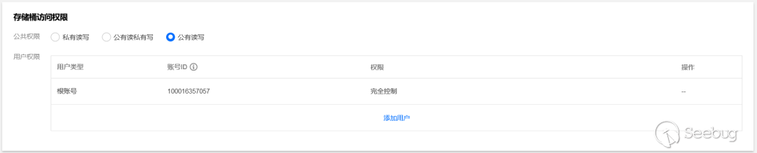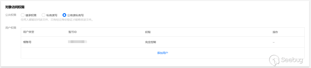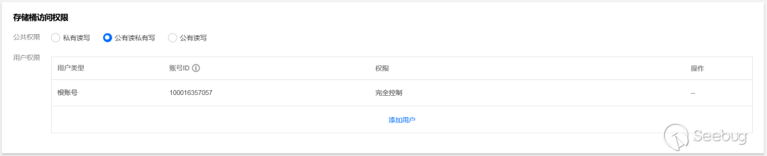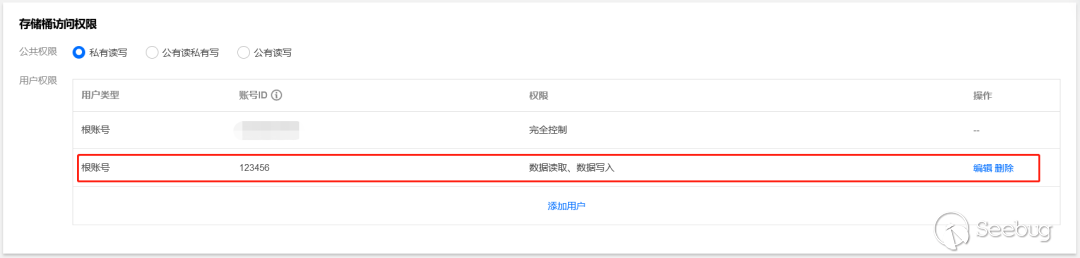 我們先保持公共權限的默認設置——私有讀寫,并在控制臺編輯用戶權限,添加一個ID為123456的賬號。