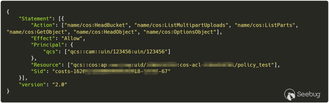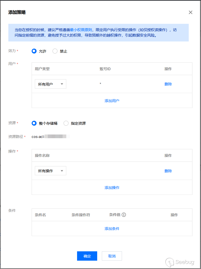 在使用存儲桶進行對象讀取或寫入操作時,如果沒有合理的或者錯誤的在Policy中配置用戶允許訪問的資源路徑(resource),則會出現越權訪問,導致用戶數據被惡意上傳覆蓋或被其他用戶下載等安全問題。