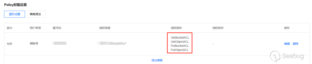 即使Policy中沒有授權該用戶讀取存儲桶、寫入存儲桶、讀取對象、寫入對象的權限,這個操作依然是及其危險的,因為該用戶可以通過修改存儲桶以及對象的ACL進行越權。