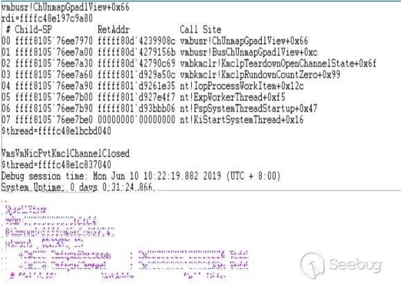 幸運的是,我找到了兩個不同的線程調用vmbusr!ChUnmapGpadlView函數,并且可以控制它們變成兩個互不干擾的線程。下圖是這兩個線程的棧回溯。