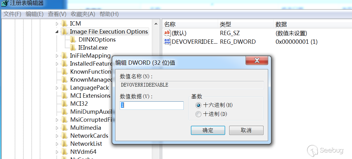 dll重定向默認為關閉狀態,我們在注冊表中 HKLM\Software\Microsoft\Windows NT\CurrentVersion\Image File Execution Options 添加 DevOverrideEnable (DWORD) 字段并設置為 1,來開啟該功能,重啟后生效。