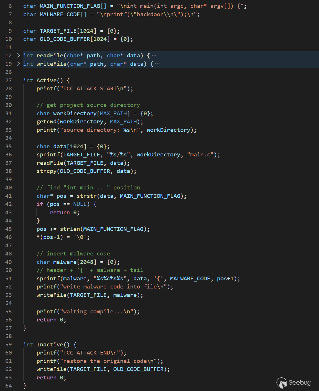 我們模仿 SUNBURST 后門植入的方法,編寫惡意代碼 demo 如下(libtcc.c + libtcc.def):