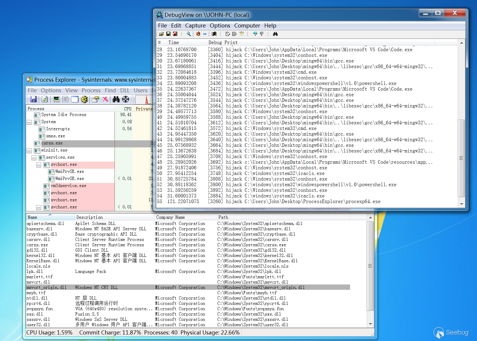比如下面是我們使用惡意 dll 替換 msvcrt.dll,惡意 dll 在加載時輸出應用程序路徑,重啟后可以看到:
