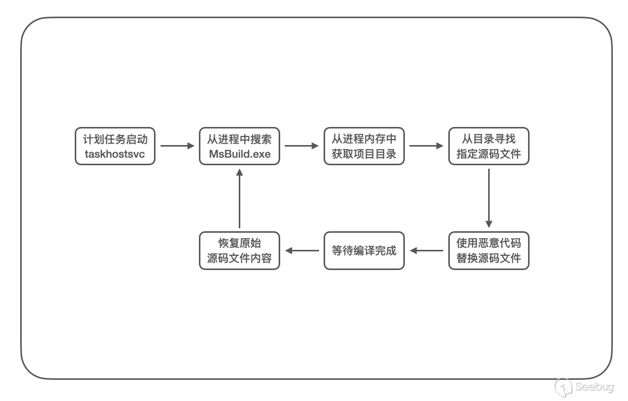 當然這個過程中還需要很多技術細節來保證后門與原始項目代碼之間的兼容性,以及植入過程的隱蔽性等等;后續就有安全研究者說到在 APT 攻擊中上文中的植入過程不夠完美,比如計劃任務和周期性的進程掃描很容易暴露攻擊行為,其次監控 MsBuild.exe 運行到最終替換源碼文件,這中間的執行時間可能影響后門植入的成功率。