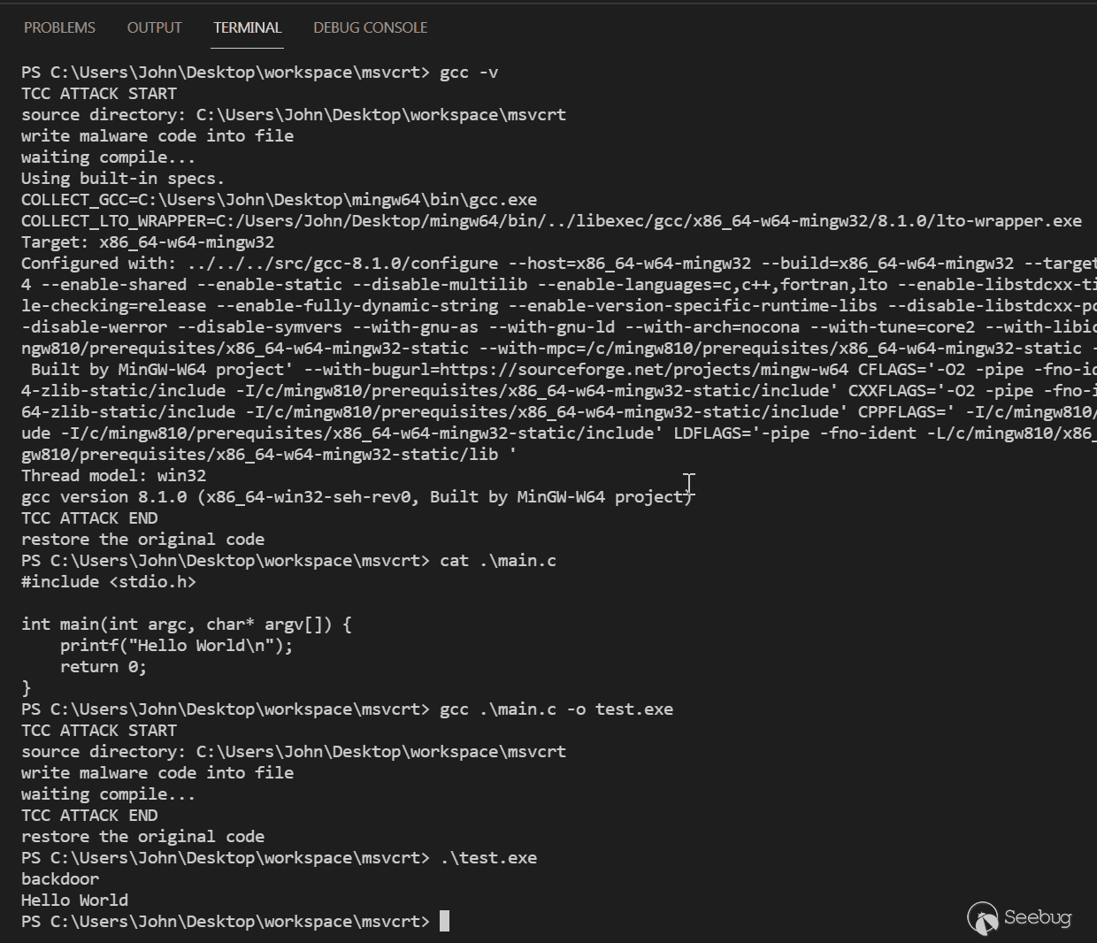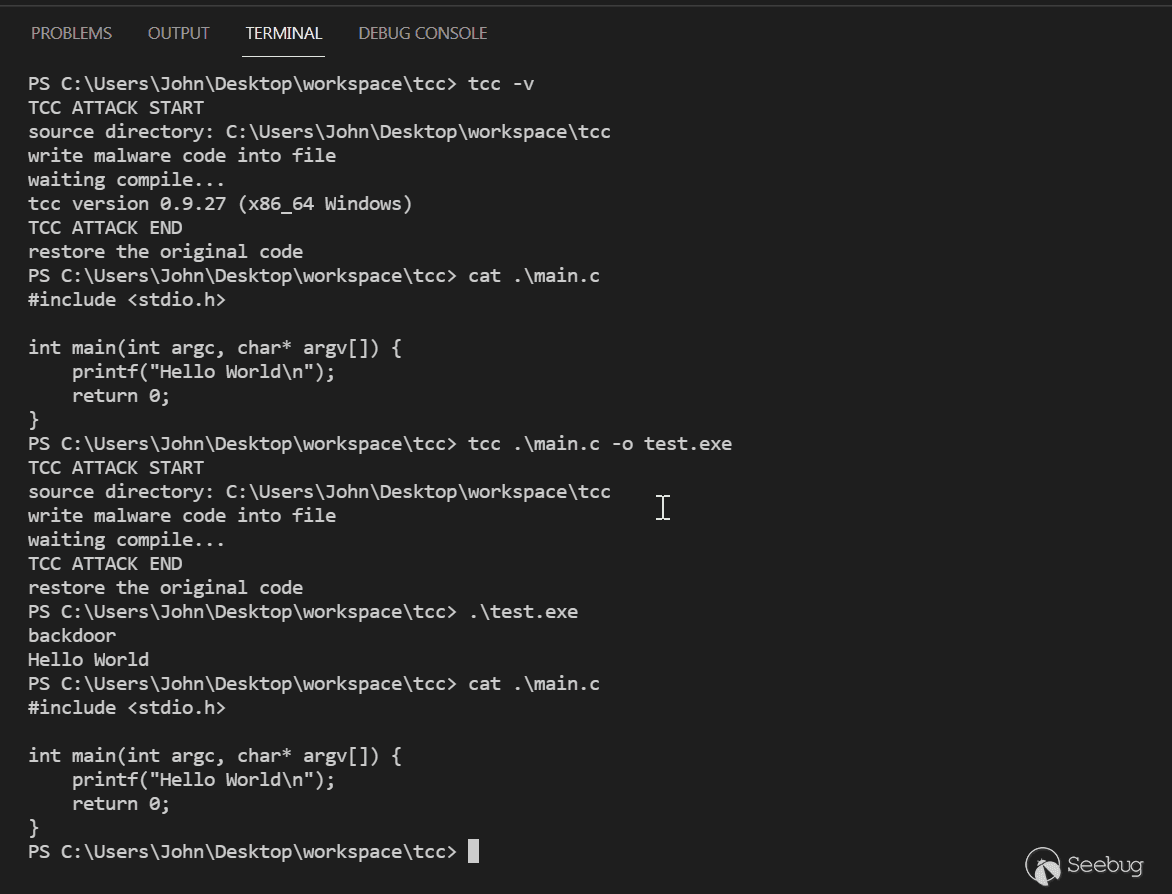 可以看到通過 Tcc 編譯的程序,執行時觸發了惡意代碼 backdoor。