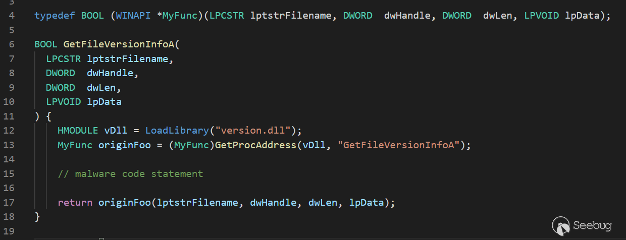 在 .def 文件中我們將原始的文件命名為 version_origin.dll,當應用程序運行時將加載我們惡意的 version.dll,當調用函數時,將由惡意的 version.dll 進行函數轉發: