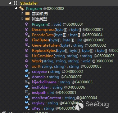 credwiz.exe是一個系統文件,它會加載Duser.dll。這里使用的是 DLL Side-loading 方法來執行惡意代碼。preBotHta類和Program類中的成員變量copyexe,hijackdllname,instfolder,instpath,program保存了配置信息。