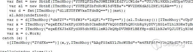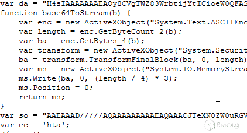 這種類型攻擊方法通常是向受害者發送一個包含CVE-2017-11882漏洞利用的文檔或者LNK文件,它們執行后釋放或者下載執行邏輯相同的HTA文件。這些文件大多是經過混淆和簡單的加密的,一個典型的例子如下